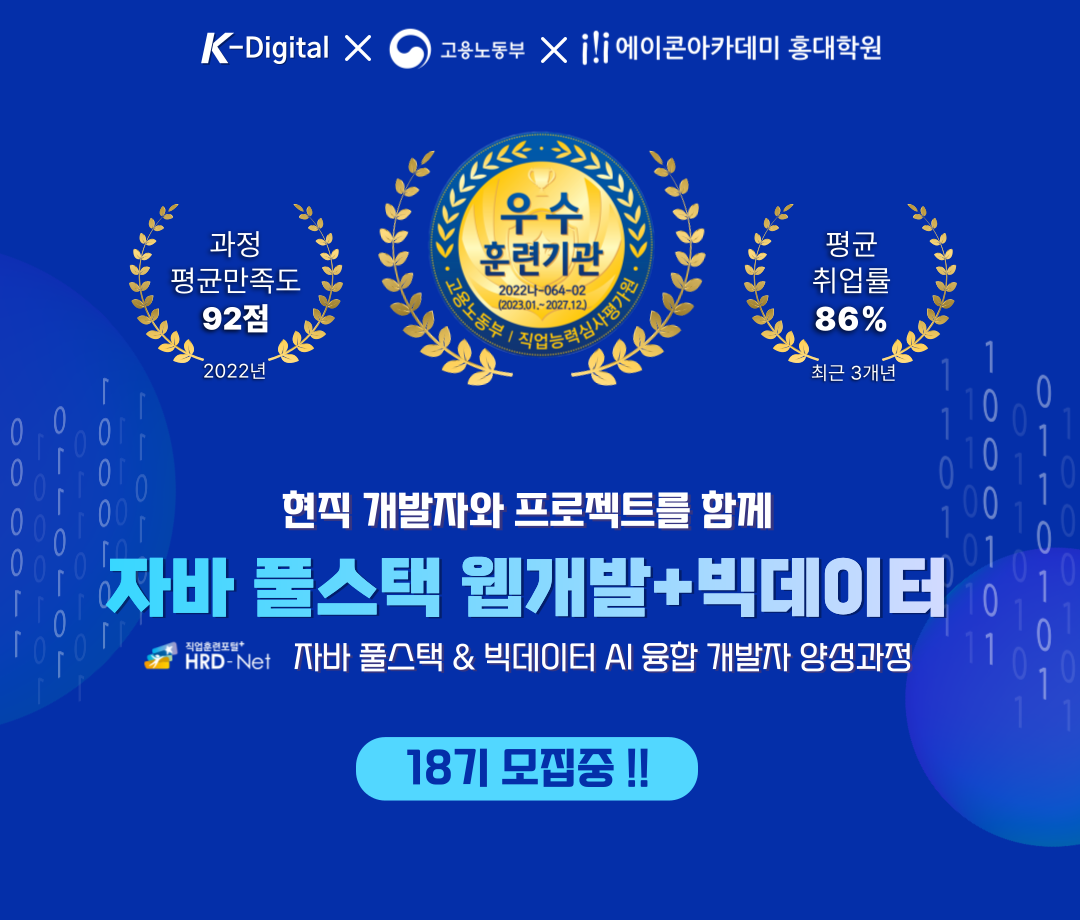 한국강사신문 송지우 기자] 고용노동부 5년 인증 우수훈련기관인 IT학원 에이콘아카데미 홍대학원이 오는 4월 현직 개발자들과 함께하는 ‘4.15 자바 웹개발·빅데이터 18기’ 과정을 개강한다고 밝혔다.
